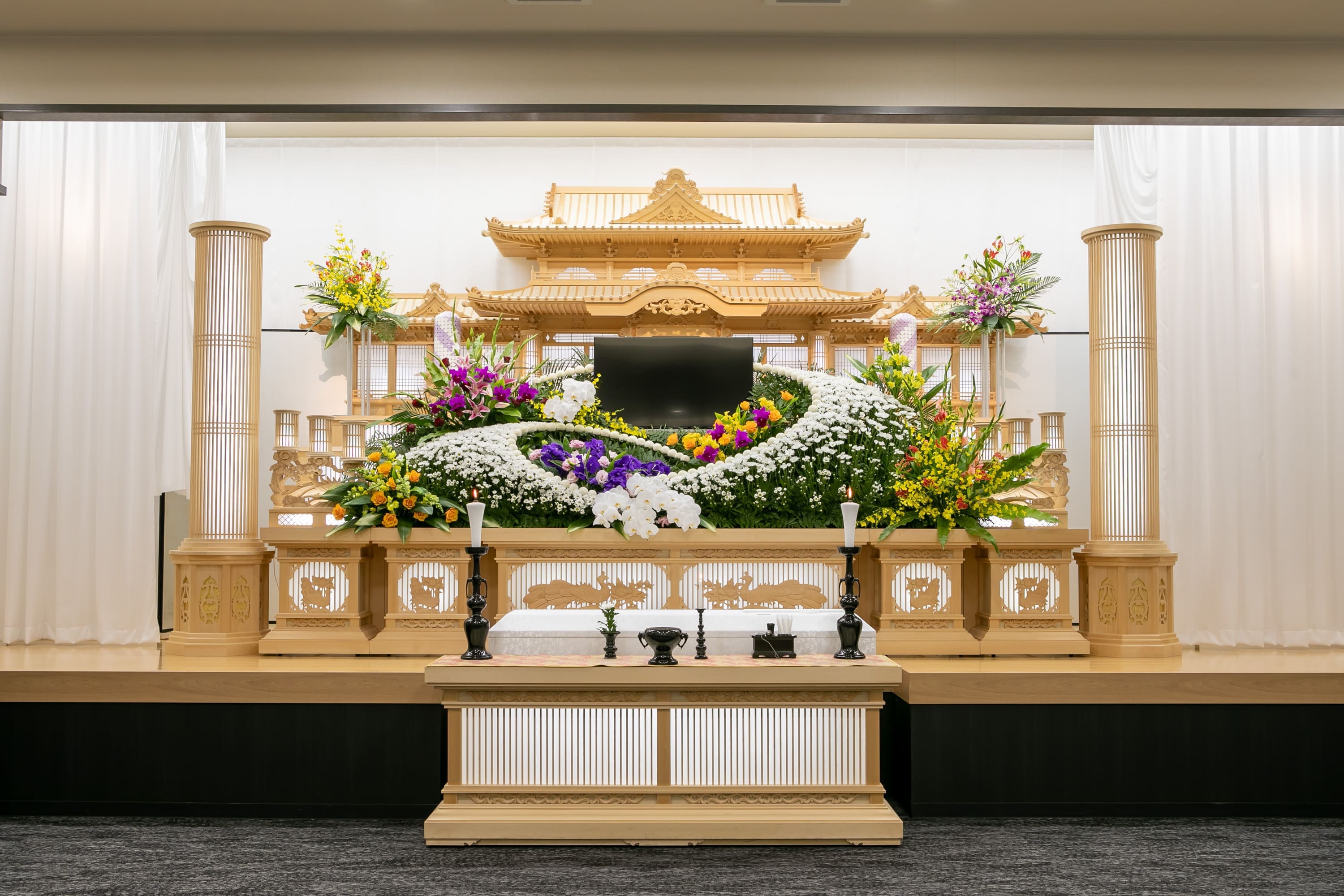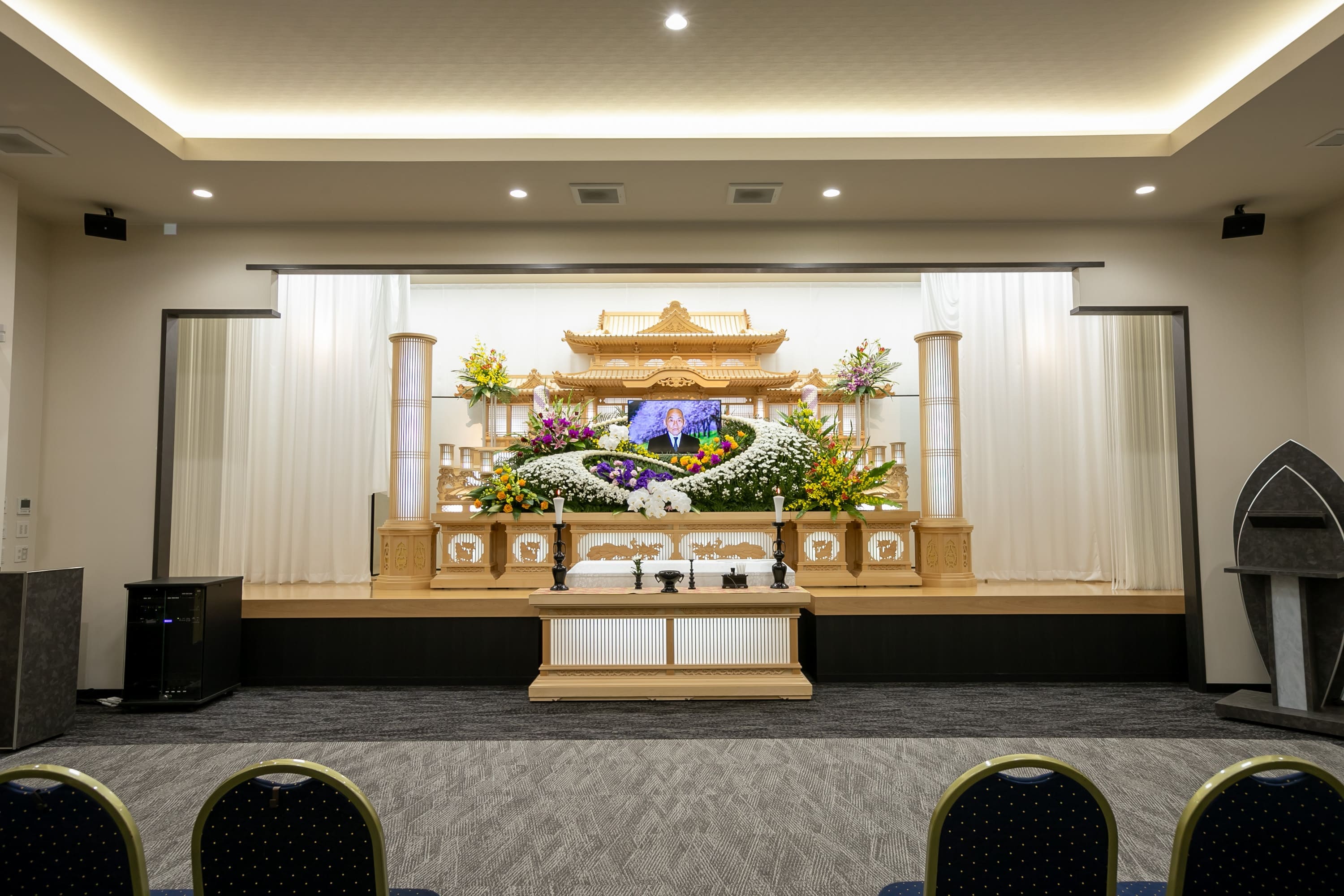 一般葬から社葬や団体葬まで幅広くご利用いただけます。華麗なオリジナル装花や最新の音響設備のほか、プロジェクションマッピングなど、あらゆる演出に対応し、華やかで印象的なセレモニーを実現します。