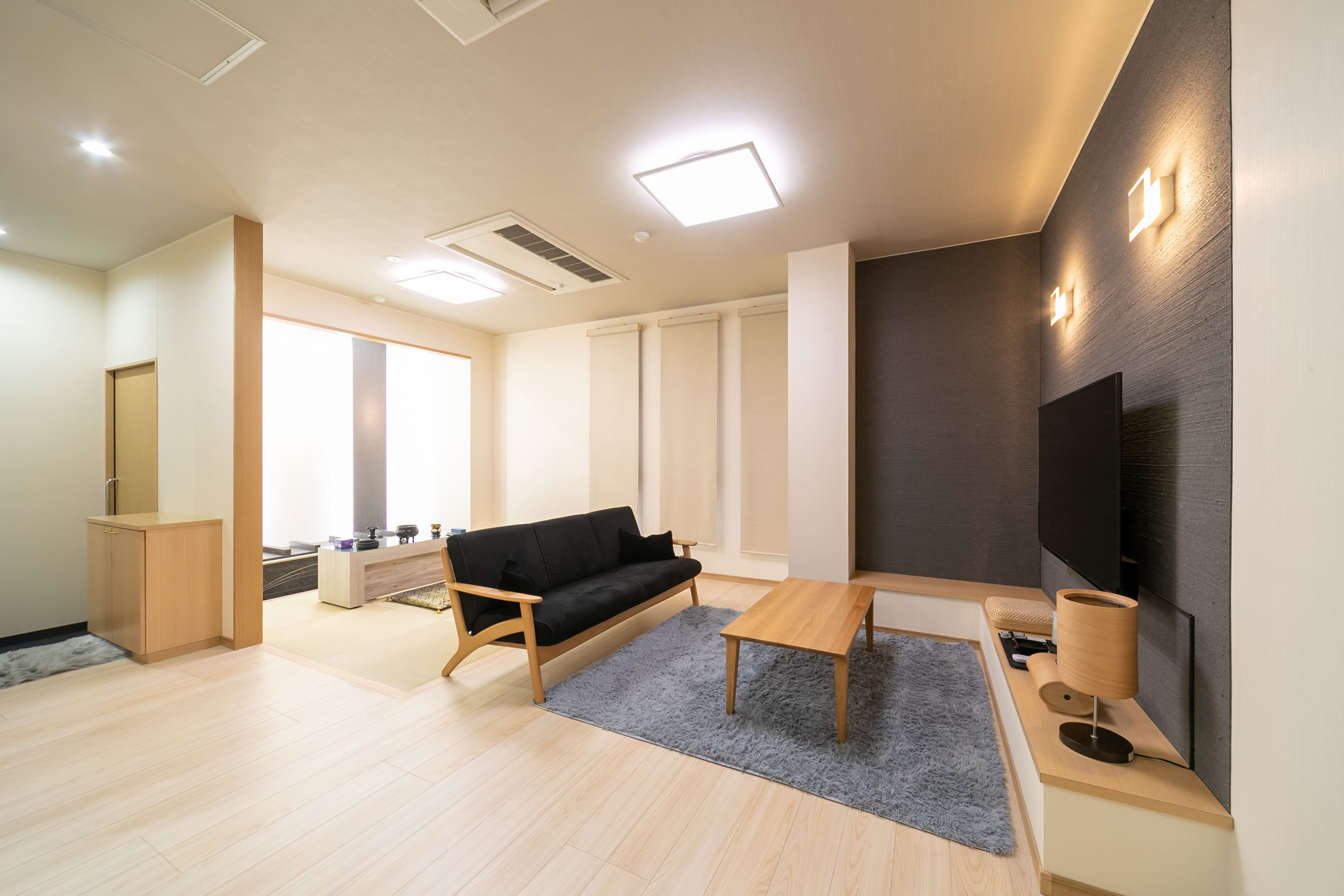 親族の皆さまに心安らかに過ごしていただけるよう配慮した親族控室。季節を問わず快適な室温を保つ床暖房に、ジェットバスやシステムキッチンも完備。家具・家電にいたるまで快適さを追求したラグジュアリーな空間です。