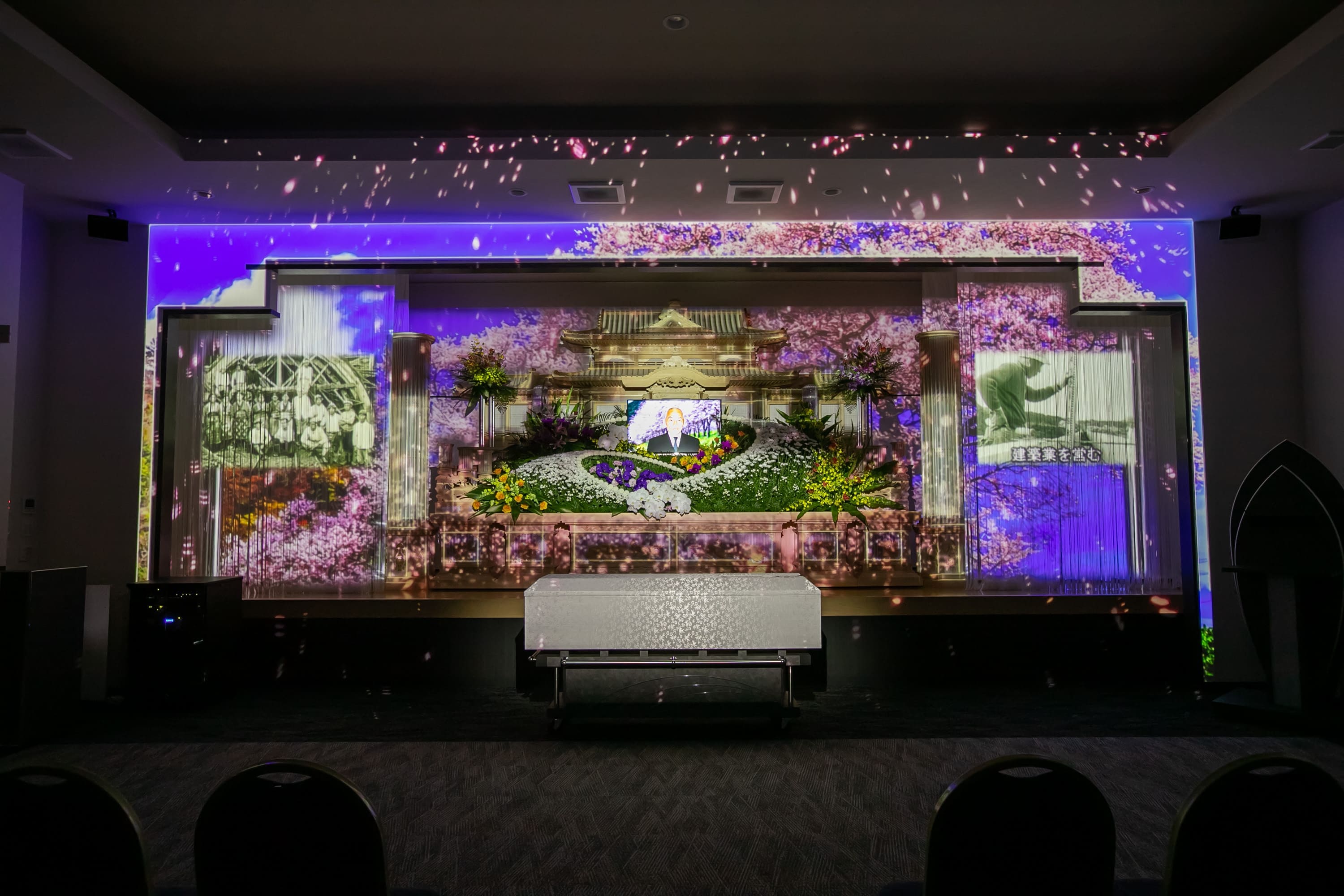 一般葬から社葬や団体葬まで幅広くご利用いただけます。華麗なオリジナル装花や最新の音響設備のほか、プロジェクションマッピングなど、あらゆる演出に対応し、華やかで印象的なセレモニーを実現します。