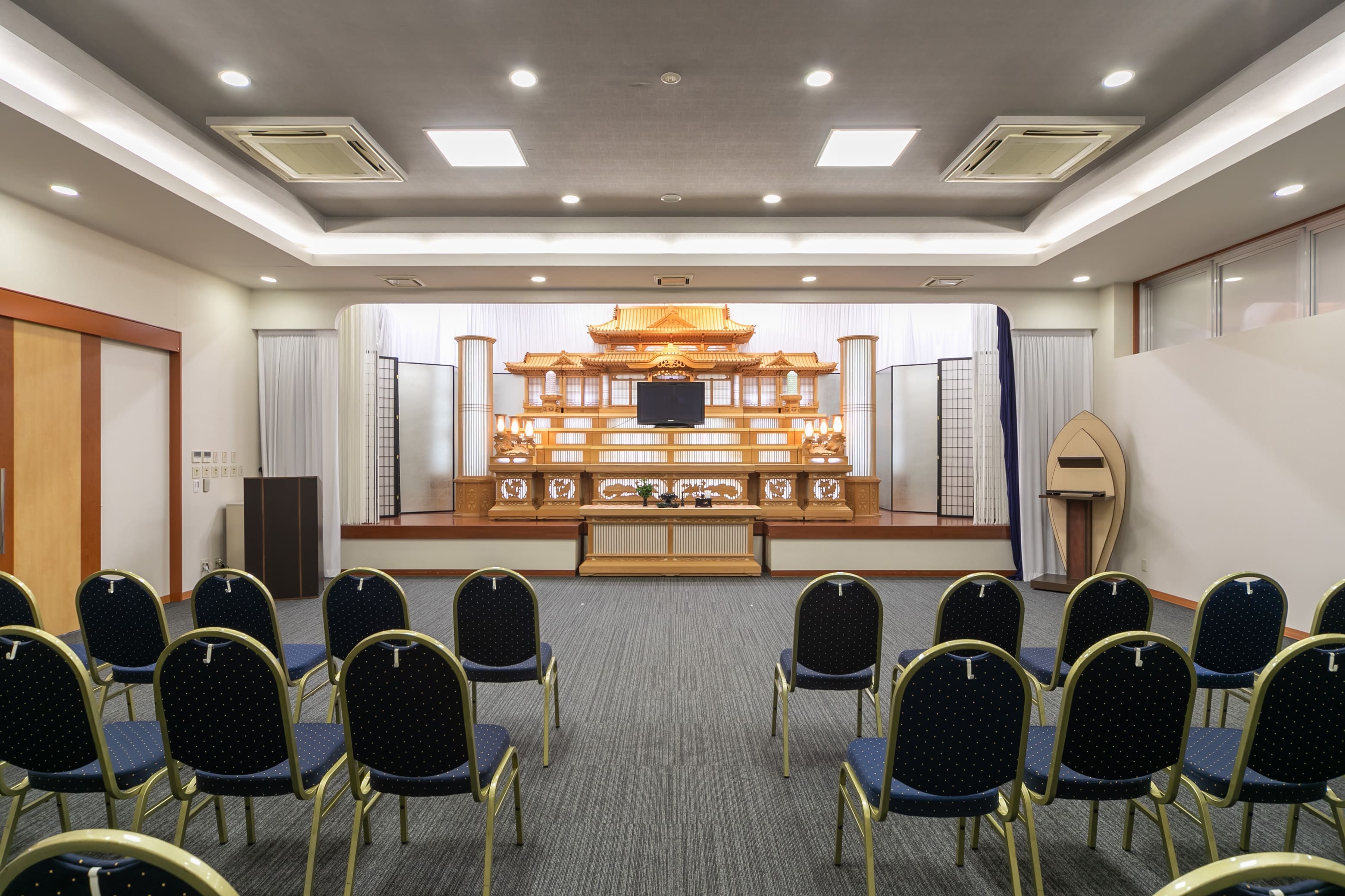 大人数でもゆとりある広さで、一般葬から社葬や団体葬まで幅広くご利用いただけます。大規模な祭壇はオリジナル装花で演出し、プロジェクションマッピング対応も可能なため華やかなお見送りがかないます。