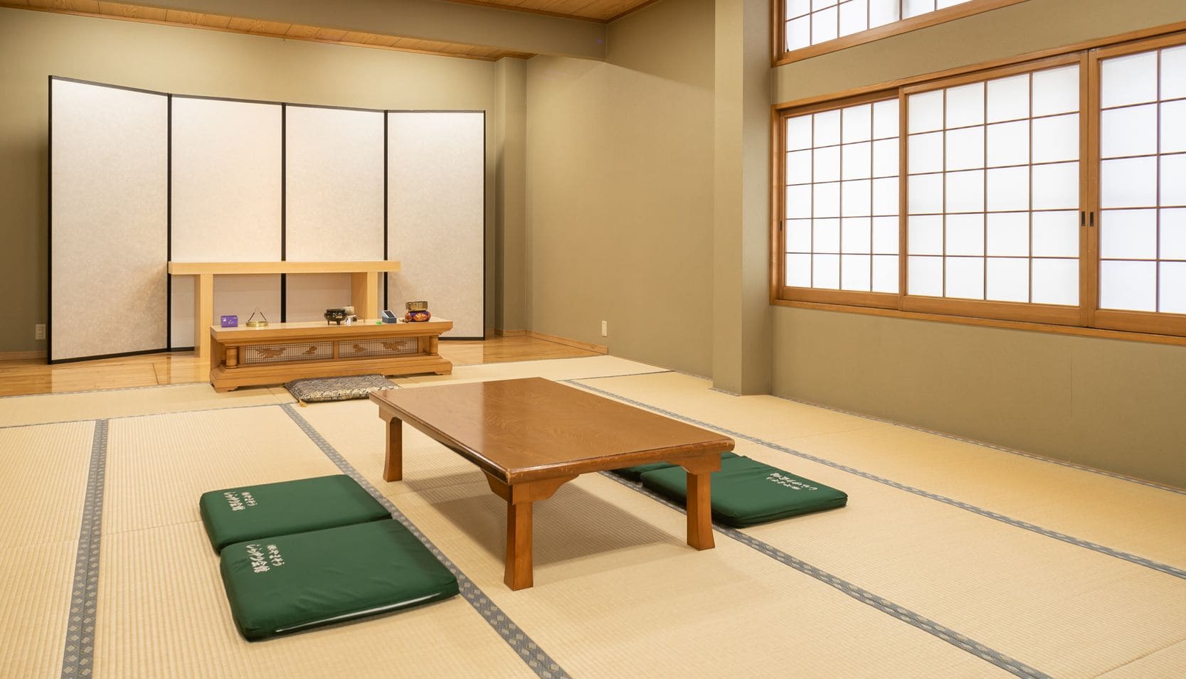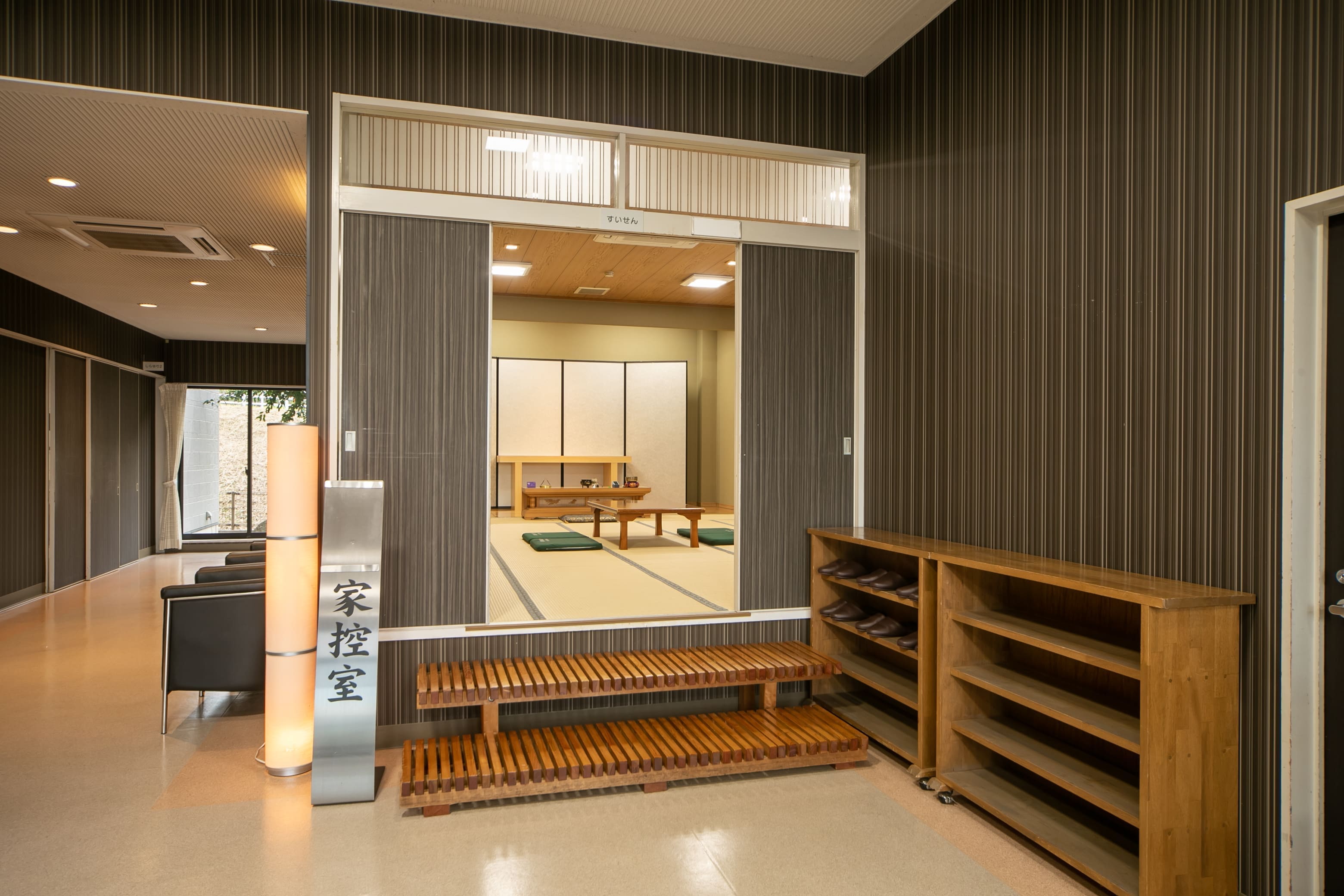 和モダンなテイストの内装は、時代を経てもなお古さを感じさせない、落ち着きのある佇まいです。日本庭園を望むロビーや小上がりの和室の控室など、くつろげる空間を整えています。また、少人数での家族葬(一日葬)から大人数のご参列まで、あらゆるニーズにフレキシブルに対応いたします。ご希望やご相談は、いつでもお気軽にお問い合わせください。