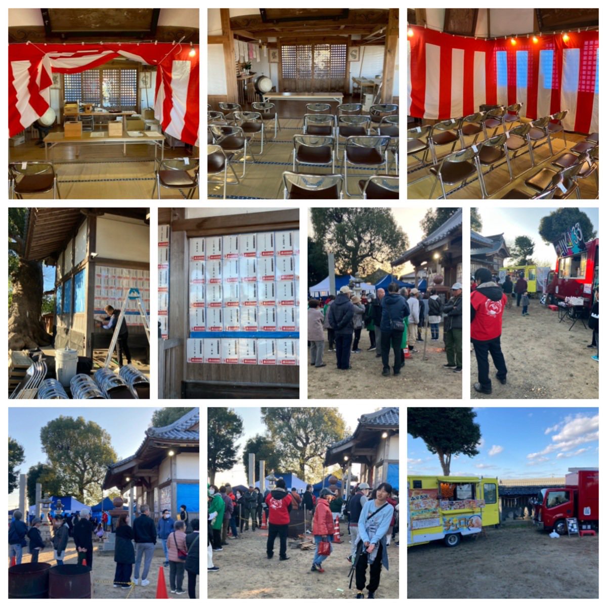 準備から参加させて頂き、厳かな神事・「菓子まき」や「餅まき」・お楽しみのくじ引きなどのイベントにも盛り上がり、地域の皆様との触れ合いもでき、有意義な刻を過ごさせて頂きました。 会場では小竹町商工会女性部の皆様による「ひれ酒・おでん・ぜんざい・唐揚げ・けたこシリーズ」の販売や、お菓子・お寿司のキッチンカーも出店しておりました。